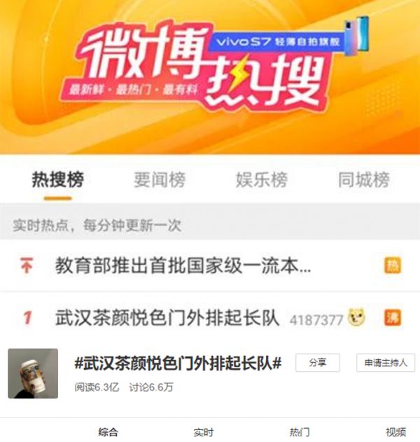 当日,微博话题#武汉茶颜悦色门外排起长队#登顶热搜榜,阅读量至今已达6.3亿。