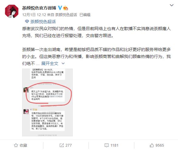 与此同时,网上开始流传一张"奶茶店充场3小时40元工费"的群聊截图。中午时分,茶颜悦色官方微博对此作出了回应,"感谢武汉民众对我们的热情,但是目前网络上也有人在散播不实消息说茶颜雇人充场,我们已经在进行报警处理,交由警方跟进。"