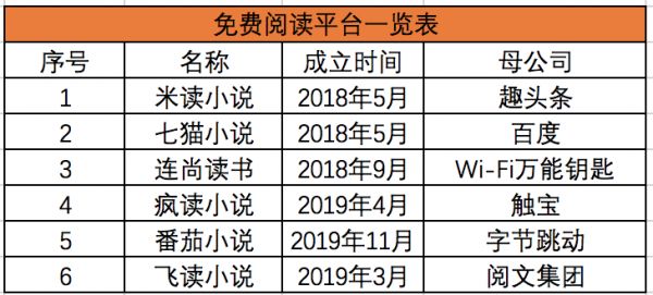 2018年,是免费市场兴起的一年。在这一年,米读、连尚、七猫相继进入战场;2019年免费市场继续扩容,阅文上线飞读小说,头条自建番茄小说,后来者疯读小说势头强劲。