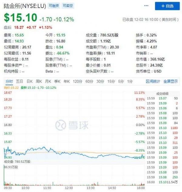 美东时间12月1日美股盘后,陆金所发布了2020财年第三季度的财务报告,这也是陆金所上市之后的首份财报。受净利润下滑影响,业绩报公布后,陆金所盘后最低报价14.87美元/股,较收盘价暴跌逾11%。