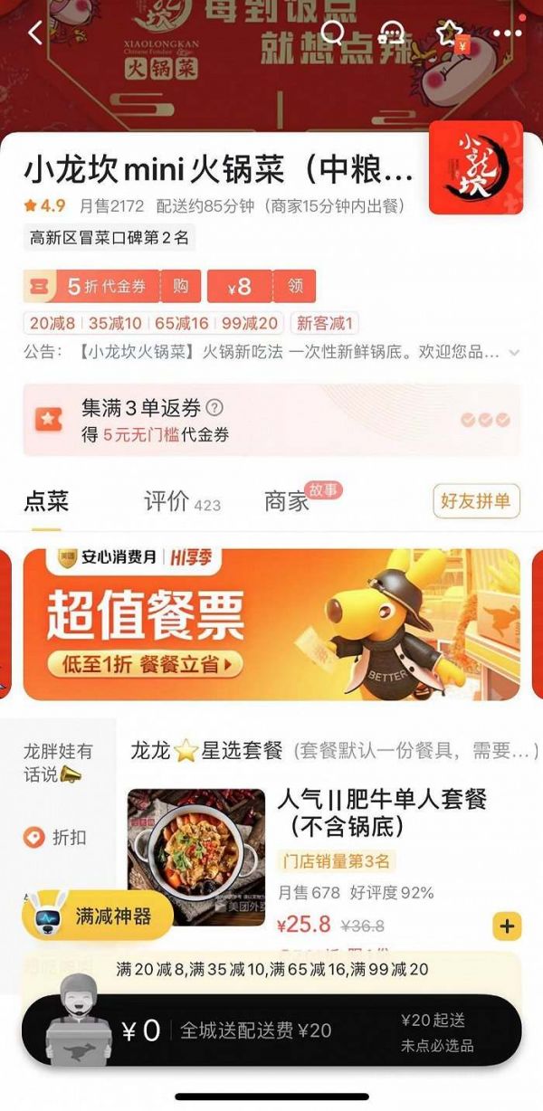界面新闻从美团、饿了么等外卖平台搜索发现,“小龙坎mini火锅菜”于近期上线运营,全部集中在成都一地。尽管店内宣传打出了“火锅菜”的名头,但从产品上看,其主打的其实是冒菜。目前,打折后的单人套餐价格在25-36元之间。