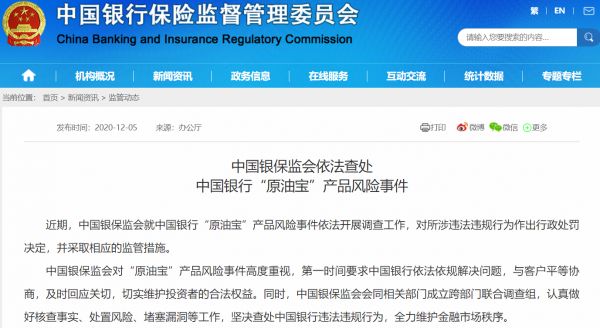 近期,中国银保监会就中国银行"原油宝"产品风险事件依法开展调查工作,对所涉违法违规行为作出行政处罚决定,并采取相应的监管措施。