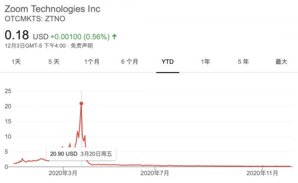 今年3月,美股闹了一出罕见大乌龙:一家名为Zoom Technogogies、代码ZOOM(现已替换为ZTNO)的公司股价急剧拉升,最高点与年初股价相比疯涨18倍。