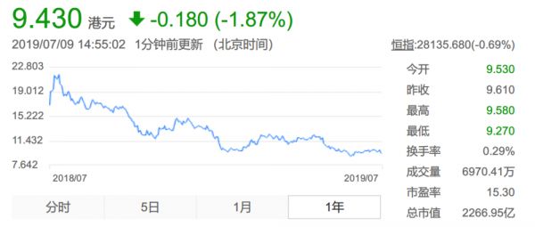 7 月 9 日,小米股价报 9.43 港元,较 17 港元/股的发行价跌去了 44.5%,而相较 22.2 港元/股的最高价,更是跌去了一半以上,对应市值为 2266.95 亿元,一年之内,小米市值蒸发了近 1500 亿港元。