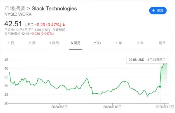 以上就是为什么投资者对Slack态度冷淡的原因,甚至已经开始恶化——在Salesforce收购Slack的消息泄露前,Slack的股价自上市以来已经消失了约四分之一,甚至在疫情期间,也没有太大的增幅。与之相比较,其它“线上办公”公司的股价如Zoom则在今年3月之后大涨特涨。