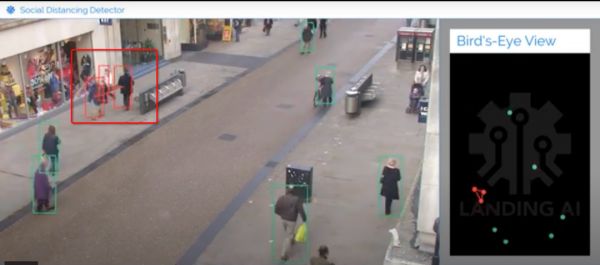 疫情期间,Landing AI 还在其官方博客平台上发布了一款社交距离监控工具,其中包含一个演示视频,基于公开街景数据集 The Oxford Town Centre 展示了新的社交距离探测器,旨在让行人彼此之间保持至少两米的距离,尽可能减少新冠病毒的传播。