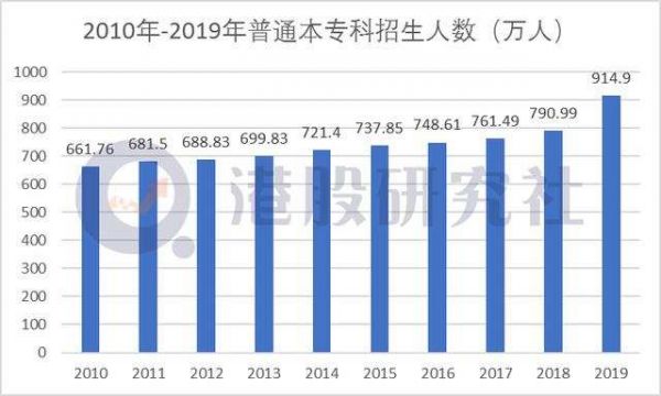根据教育部所发布的2019年教育统计公报中的数据显示,截至2019年,全国普通本专科招生914.90万人,比去年同期同比增长了15.67%。相较之下,2019年新增普通高等院校25所,同比仅增长0.94%。