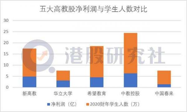 将招生人数和净利润对比可以发现一个较为明显的现象。在港股五大高教股中,净利润最高的中教控股在学生人数上也处在领先位置。而处在靠后位置的中国春来与华立大学,净利润也同样落后。