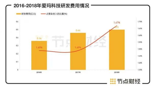 招股书显示,2016-2018年,爱玛科技的研发费用分别是0.36亿元、0.46亿元和0.5亿元,占营业收入的比重分别为1.49%、1.49%和1.67%。2019年上半年,其研发投入占比略有升高,达2.04%。爱玛科技在招股书中直言,其研发费用占比,低于可比上市公司。的确,主要竞争对手之一的雅迪股份在2017年、2018年的研发费用分别是1.83亿元、3.05亿元,占营业收入的比重为2.32%和3.07%。