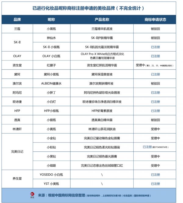 所以,品牌也开始将产品昵称作为品牌保护的一部分,随着行业对知识产权的重视程度的大大提升,近年来不少美妆企业除重视品牌名的商标注册外,也开始为产品昵称进行商标注册申请。