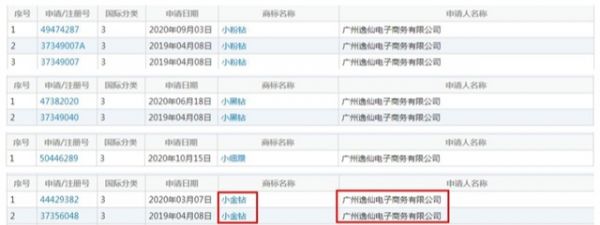 根据国家知识产权局商标局中国商标网信息显示,近两年逸仙电商先后对“小黑钻”“小金钻”“小细跟”“小完子PERFECT DIARY”等多个产品昵称进行了第3类(化妆品类)国际商标的申请。