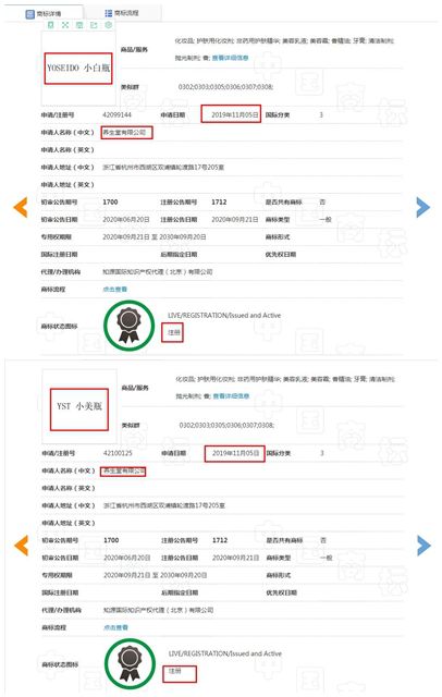 值得一提的是,养生堂2018年才初涉化妆品行业,“YOSEIDO小白瓶”“YST小美瓶”的第3类国际商标已在去年就注册成功。由此也体现其对昵称的重视及在商标注册上的未雨绸缪。