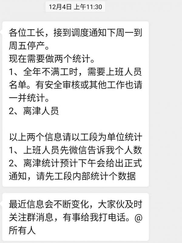 王明是一汽大众天津分公司的一名员工,上周五下班后,他就收到了工作群中的停工停产的通知。据他介绍,这个消息是群发的,也就是说天津公司将近3000名员工在本周就停工了。
