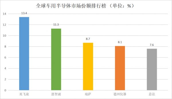 据世界分析机构Strategy Analytics发布的全球车用半导体市场份额排行榜中,英飞凌以13.4%排名第一,恩智浦、瑞萨、德州仪器和意法依次位列二到五名。