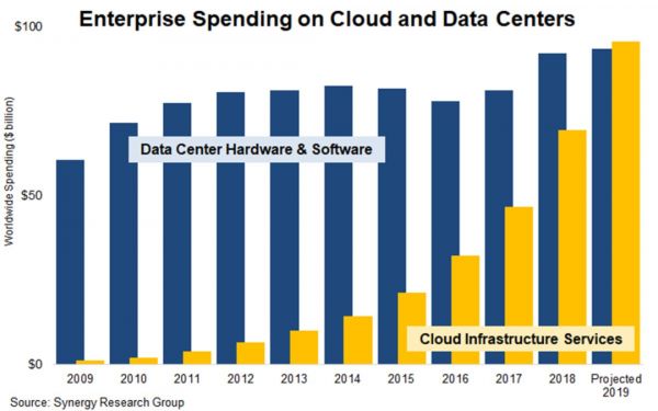 云基础设施支出在 2019 年首次超过传统数据中心支出