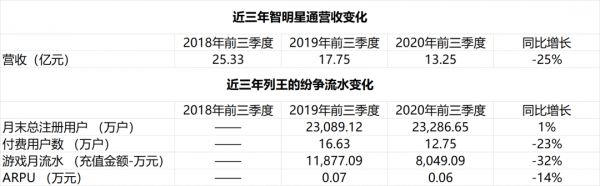 这主要是因为公司王牌产品《列王的纷争》步入衰退期。对比2019年和2020年前三季度,《列王的纷争》的游戏月流水同比大跌32%至8049万元,流水规模直接缩水了三分之一,同时付费用户数同比下跌23%。
