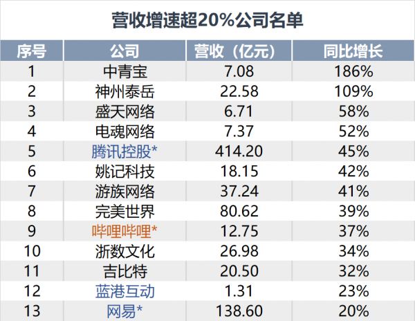增速超20%的公司则有13家,其中电魂网络、游族网络以及吉比特的增速较为亮眼,分别为52%、41%、32%。