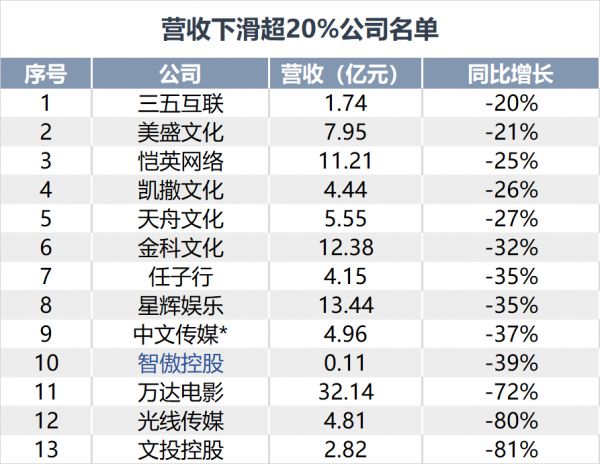 就营收下滑的公司情况来看,有21家出现营收下滑,14家同比下滑逾20%。文投控股、光线传媒以及万达电影营收下滑现象最为严重。