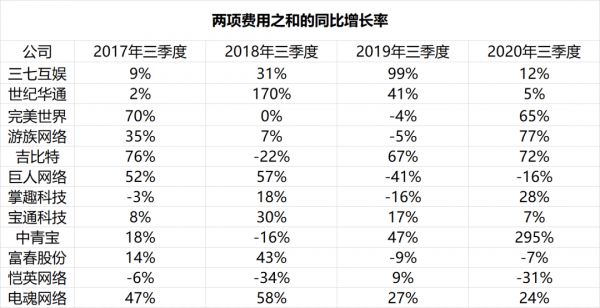 那么游戏公司的买量现状到底如何?手游那点事选取了12家以游戏为主营业务的A股上市公司,并将公司的销售费用和营业成本(其中包含了大量推广费用)相加,观察其2020年前三季度内的增速变化。