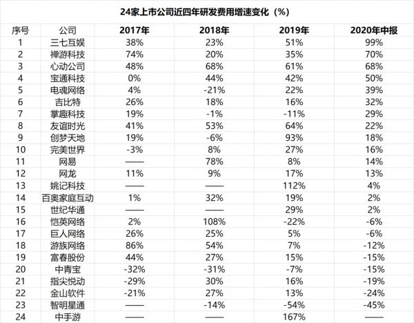 而就研发费用同比增速来看,2020年中报显示三七、禅游、心动以及宝通科技四家公司的增速均超过50%,在行业中遥遥领先。