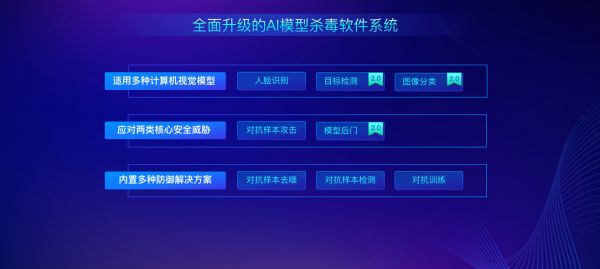 RealSafe则是企业级AI安全平台、针对人工智能模型的杀毒软件。该产品主要应用于人脸对比、目标检测、图像分类等场景,且具有算法领先、可量化、零编码等特点。RealSafe2.0版本在RealSafe1.0基础上,新增对目标检测、图像分类模型的支持,以及模型后门的检测能力,不仅拓宽了可评测的应用场景,实现了图像分类模型的后门自动化检测,还提供了包括样本去噪方法,对抗样本检测方法,对抗训练等解决方案。