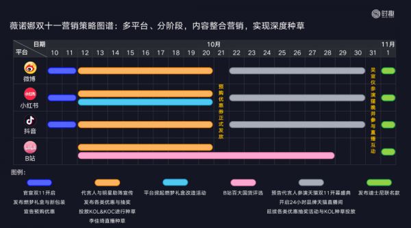 回溯十月双11热度冲刺期,薇诺娜也下足了功夫。除了首次将王炸单品突破瓶身设计、打造双11定制燃梦特护礼盒外,在10.31日天猫直播盛典中,还联手李佳琦直播,推出了特别惊喜:薇诺娜魔法米奇燃梦精华礼盒和魔法米奇柔润保湿霜。从营销端来看,薇诺娜多平台内容营销,传播声量虽不及欧莱雅、兰蔻等国际大牌的传播力度,但凭借其精准差异化定位+核心传播内容不断夯实产品“专注敏感肌肤”的用户心智,声量暴涨17倍,在众多国货美妆中,双十一销量战绩“一枝独秀”。