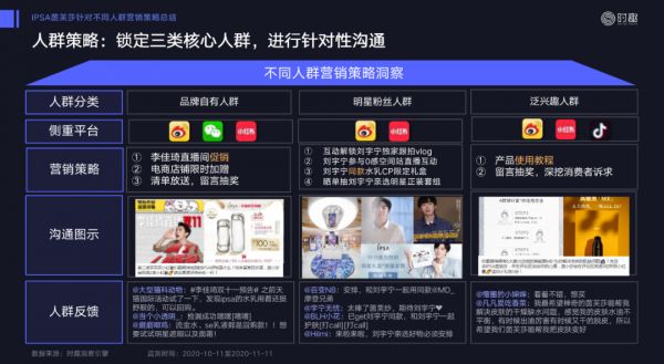 IPSA茵芙莎则采取了跨平台策略,多平台、线上线下联动,借势明星效应及天猫话题收割流量;媒介策略也是同样调动多平台,明星+KOL的整合营销方式来提升整体热度,并且锁定三大人群,品牌自有人群、明星粉丝人群、泛兴趣人群,针对不同人群和平台,采取高频多样的内容策略进行触达。