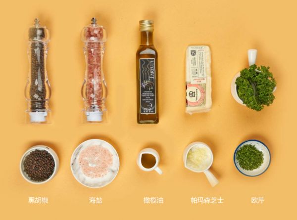 制作传统意面需要先分别采购黑胡椒、欧芹等原料和调料,然后再回归到餐厅处理,采购流程繁琐,且某些原料对于中国消费者来说并不日常配备。针对以上痛点,空刻研发了西式调料包,包括帕玛森芝士包、初榨橄榄油包、欧芹包、黑胡椒碎包等,将原料、调料精细配比组装,并产出简单烹饪的SOP。为保证口味的同时还原意面烹饪场景,煮意面用的海盐和橄榄油,也被配备到了调料包里。