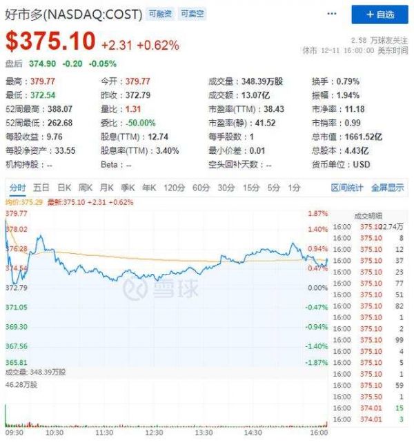 截止美股研究社发稿,Costco每股报374.90美元,总市值为1661.52亿美元。