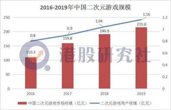 不管是原神的爆火还是互联网巨头纷纷涉足这一板块,背后都是行业潜力的释放。2016年,《阴阳师》等二次元游戏发行使得这一赛道初露锋芒,至2019年,中国二次元游戏用户数量为1.16亿,同比增长10.7%,中国二次元游戏市场规模为215.6亿元,同比增长12.9%。