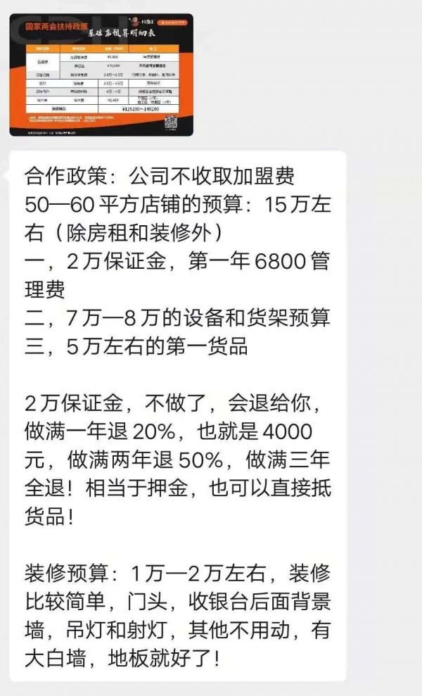 “不收加盟费”其实是个伪概念。铅笔道向火锅食材品牌“川鼎汇”咨询加盟事宜,对方表示公司不收取加盟费,但每年会收取6800元品牌管理费,以及2万元保证金。做够一年,保证金可退还4000元;做够两年,可退还1万元;做够三年,保证金可全部退还。