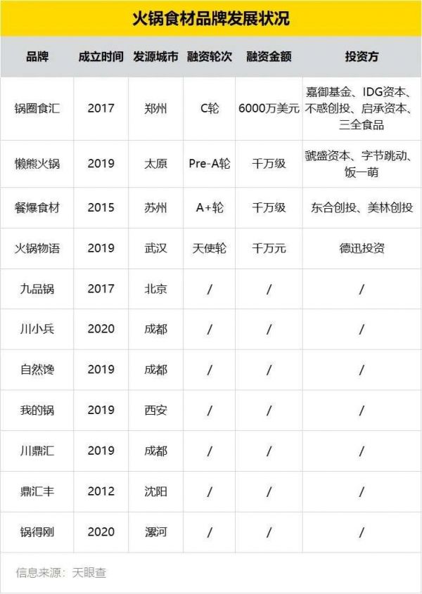火锅食材超市的生意一下子火了,也涌现出了一些头部玩家。锅圈食汇成立3年,加盟店已经拓展至5000家,过去两年融资4轮,总额近10亿元,IDG资本更是在今年连投两轮;另一玩家懒熊火锅今年也完成了2轮融资,字节跳动也成为其投资方。