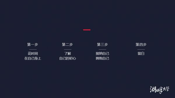 第三步是要接纳自己、拥抱自己。有很长一段时间,在夜深人静的时候,我的内心经常会跳出另一个自己指责自己,虽然它帮助我做了很多反省和成长,但是我每天晚上都很痛苦,不能安心睡觉。但最近两年,我通过拥抱自己,接纳自己的不完美,逐渐克服了这种情况。