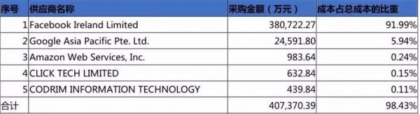 2018年,公司前五大供应商合计占比98.43%,其中对排名第一的Facebook采购金额达到38.07亿元,占比91.99%,存在单一供应商占比过大风险。