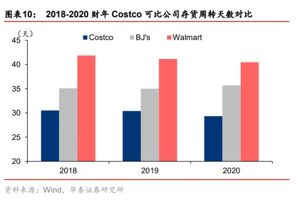 同时,较低的毛利以及大规模的包装能够帮助Costco实现存货的高周转,2018~2020财年Costco的存货周转天数为30天,显著低于BJ’s和沃尔玛。
