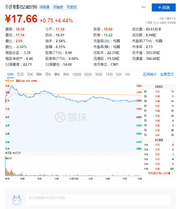 12月15日早间万达电影股价开盘大涨,一度触及涨停,截至晚间收盘涨幅仍高达4.44%,收于17.66元每股。有市场人士分析,万达电影股价强势的主要原因是证监会公布的退市新规利好,终于可以不用ST了。