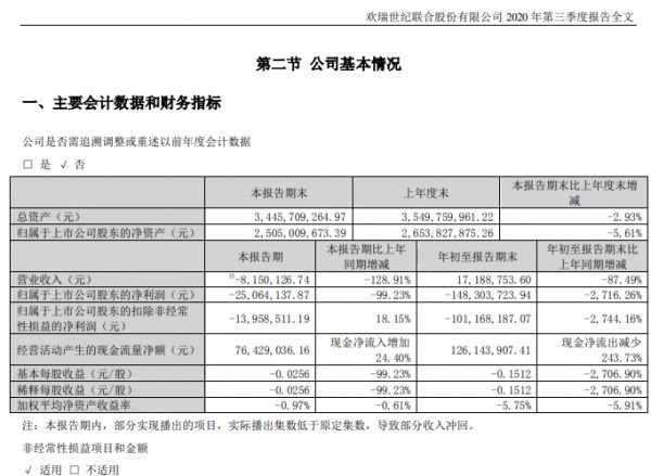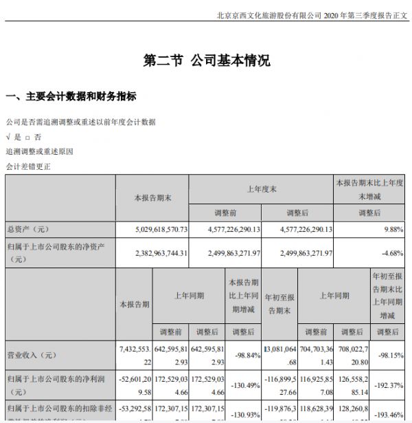 最新的2020年三季报资料显示,北京文化实现营业收入1308.11万元,相比于2019年同期下降98.15%;净利润亏损1.17亿元,整体的业绩下滑非常严重,全年没有能够拿得出手的影视作品。
