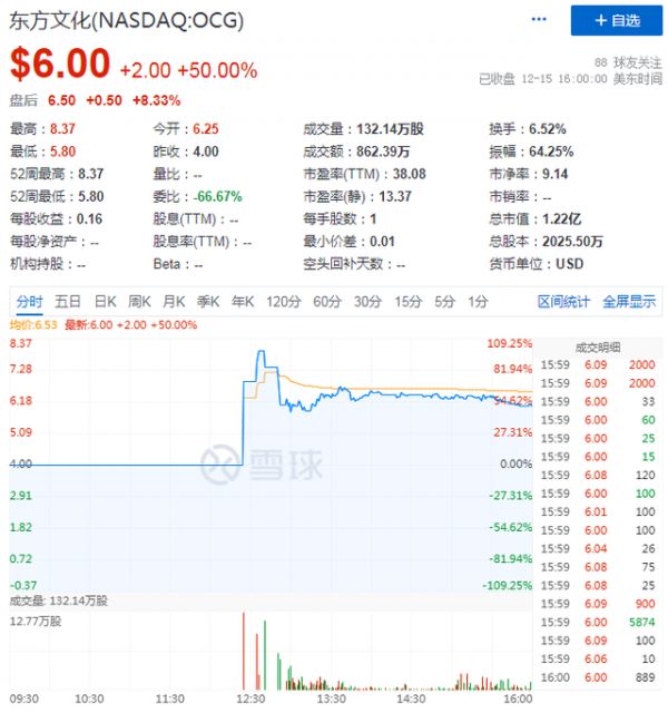 美国东部时间12月15日,东方文化控股公司正式登陆纳斯达克,开盘报6.25美元,较其4美元的IPO发行价上涨56.25%。截止美股研究社发稿,东方文化每股报6.50美元,市值1.22亿美元。