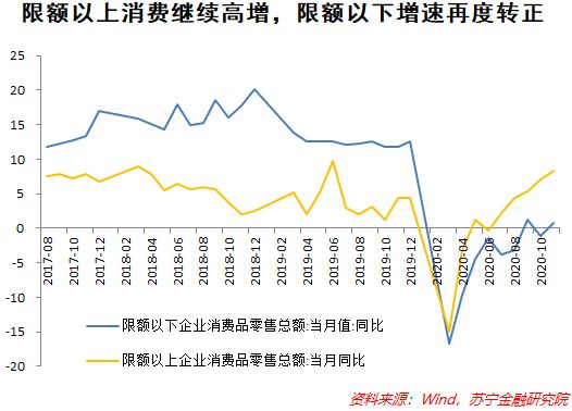 前期消费复苏过程中的薄弱部门,限额以下消费增速在经过短暂波动后,在11月同比再次转正,支撑了消费增长,同时限额以上消费仍然保持高速增长,增速已经达到近几年高点,背后是汽车、家电等大件消费、网上消费的持续回暖。