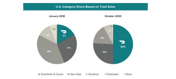 从斯坦福大学的一间小小宿舍开始,2013年成立的DoorDash仅用七年时间就超越了美国最大的外卖公司Grubhub,最终以387亿美元的市值站上了纽交所舞台。今天,DoorDash与其收购的Caviar占据着美国外卖市场50%的份额,是名副其实的“外卖霸主”。