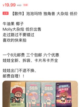 有的是不同系列,各种款式公仔混搭,按斤批发,价格介乎一斤50~120元,手办成色比较脏满是污迹,或存在缺胳膊少腿,零件缺失的情况;有的成色较好,商品详情标注了“仅有轻微瑕疵”字样,售价较高,6~10只起售,平均每只的价格3~10元不等。一些可以由买家自行选择公仔的款式,则每只售15元,购买五只商家随机赠送三只,运气好的甚至可以得到隐藏款手办。