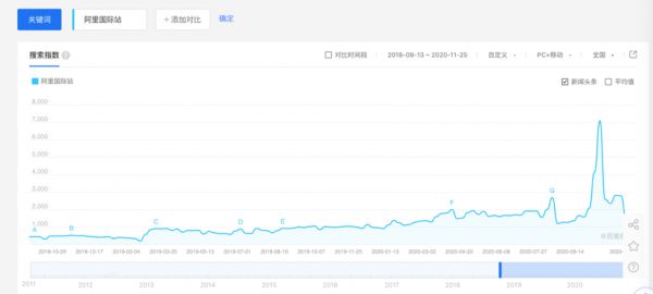 百度指数中,“阿里国际站”的热度在进入2020年后增长迅速