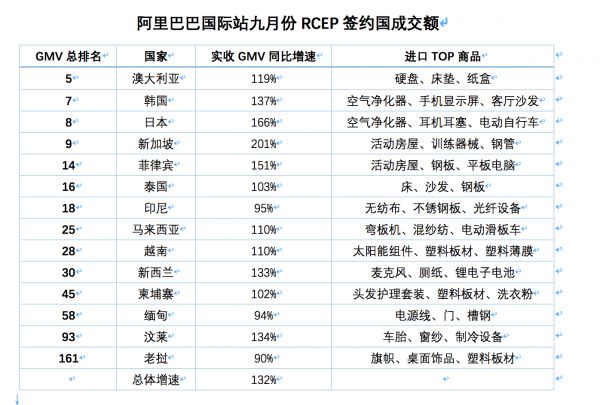 今年1-6月,在阿里巴巴国际站,中国与RECP14国之间的跨境贸易成交额总体同比增长69%;今年9月,在阿里巴巴国际站,中国与14国之间的跨境贸易成交额总体同比增长132%。