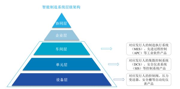 在制造系统中,中控技术的产品主要覆盖智能制造系统架构初级的三个维度层级:设备层、单元层、车间层。通过自动化控制系统指挥控制物理生产流程,现场仪表对生产过程的各种参数进行监测、反馈和处理,工业软件优化生产计划和执行。