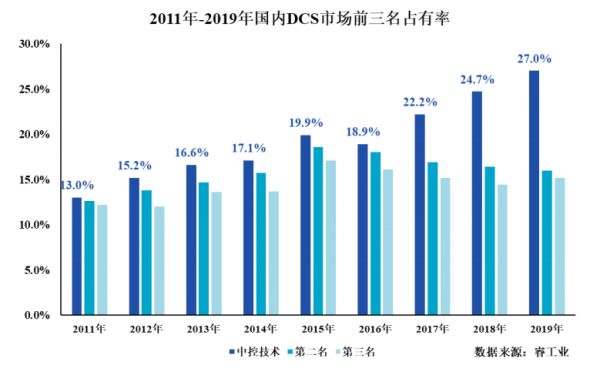 根据招股书数据,2019年度中,中控技术核心产品DCS系统在国内的市场占有率达到了 27.0%,连续九年蝉联国内 DCS 市场占有率第一名,其中在化工领域的市场占有率达到 40.7%,在可靠性、稳定性、可用性等方面均已达到国际先进水平。