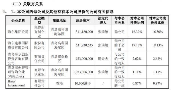 而海尔智家披露的关联方中,“青岛海尔创业投资咨询有限公司”的法定代表人周云杰,又是海尔电器的董事会主席兼执行董事。
