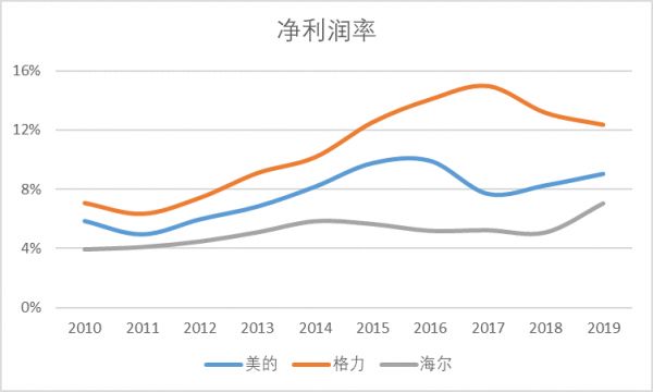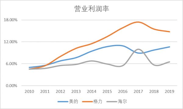 营业利润率反映了考虑经营成本的情况下企业的盈利能力。从上图中可以看出,排除异动年份,海尔的盈利能力始终是三者中最弱的。