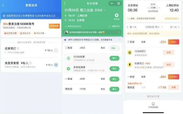 从左到右分别为携程、同程旅行、飞猪的火车票页面