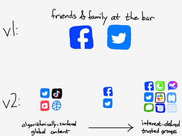 就网络的深度而言,这是更自然的聊天方式,聊天服务对v1社交网络连接的威胁,就像TikTok对Facebook控制住注意力的威胁一样:我同时可以是Fiefdom上面的雄鹿球迷,我的Slack群上面的技术爱好者,也可以与我的WhatsApp群一起探讨想法,并与我可信赖的朋友们谈论政治。在所有这些群里面的我都不是我自己的全部,这属于功能,而不是错误,而且这种分身术只有数字化才可以实现。