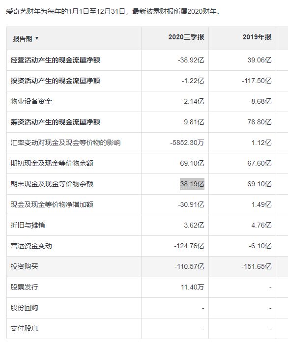 截至2020年9月30日,爱奇艺持有现金、现金等价物余额仅为38.19亿元,比年初的时候减少了30亿元。